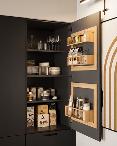Optimiza cada centímetro con estas estanterías inteligentemente integradas en la puerta. Perfectas para tener al alcance especias, sobres, condimentos o pequeñas provisiones del día a día, ofrecen un almacenamiento funcional y estético, sin ocupar espacio en el interior del mueble.
