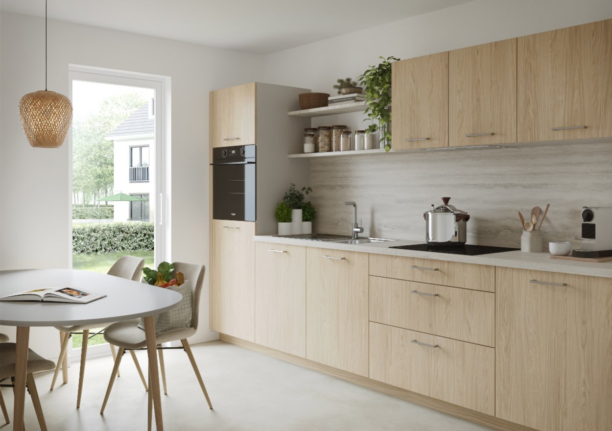 Imitación de roble y líneas depuradas, el modelo Linéa tiene ese je-ne-sais-quoi clásico que la hace tan invitadora. Aquí se charla, se picotea algo y, a veces, se dejan los platos sin fregar hasta el día siguiente.