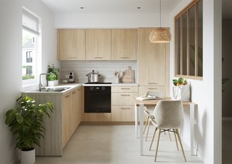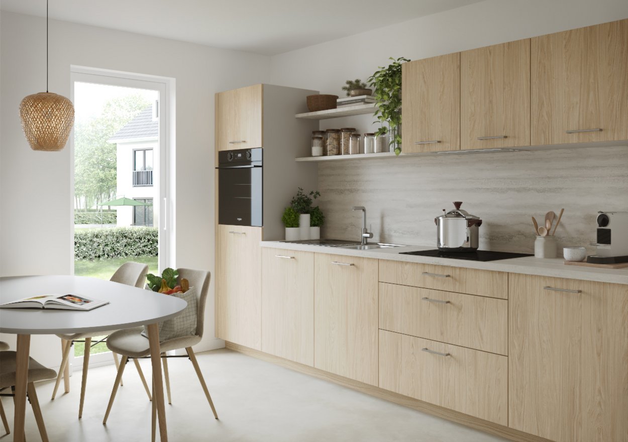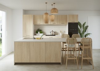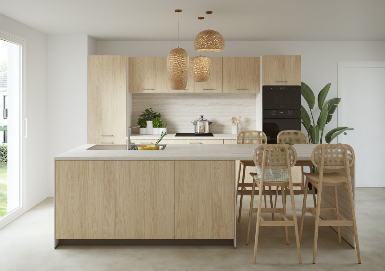 la Cocina Linea Familia seduce por su acabado en madera de roble de Como, que aporta suavidad y autenticidad al espacio. Diseñada para adaptarse al ritmo de la vida familiar, la Cocina Linea Familia cuenta con una distribución práctica que favorece una circulación fluida y un confort de uso en el día a día. La mesa integrada de la Cocina Linea Familia prolonga armoniosamente la encimera, creando un espacio de convivencia ideal para compartir una comida, acompañar los deberes o simplemente conversar con sencillez. El fregadero tipo timbre, verdadero elemento distintivo, refuerza el carácter encantador y atemporal de esta cocina, al tiempo que ofrece una gran funcionalidad. La Cocina Linea Familia combina estilo, confort y convivencia; una cocina pensada para reunir.