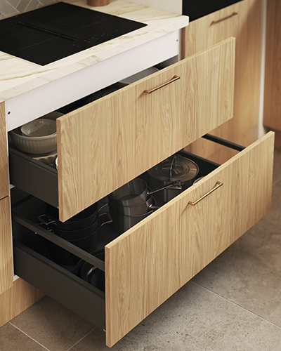 Con sus cajones amplios y perfectamente organizados, el módulo cacerolero permite guardar ollas, sartenes y utensilios con total facilidad. Todo queda visible, accesible y bien ordenado para cocinar de forma eficiente, incluso cuando el ritmo se acelera.