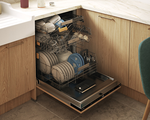 Integrado con discreción, el lavavajillas toma el relevo tras las comidas animadas para mantener una cocina siempre limpia, sin esfuerzo. Su bandeja superior acoge cubiertos y cuencos, liberando espacio en los cestos inferiores y optimizando cada lavado.
