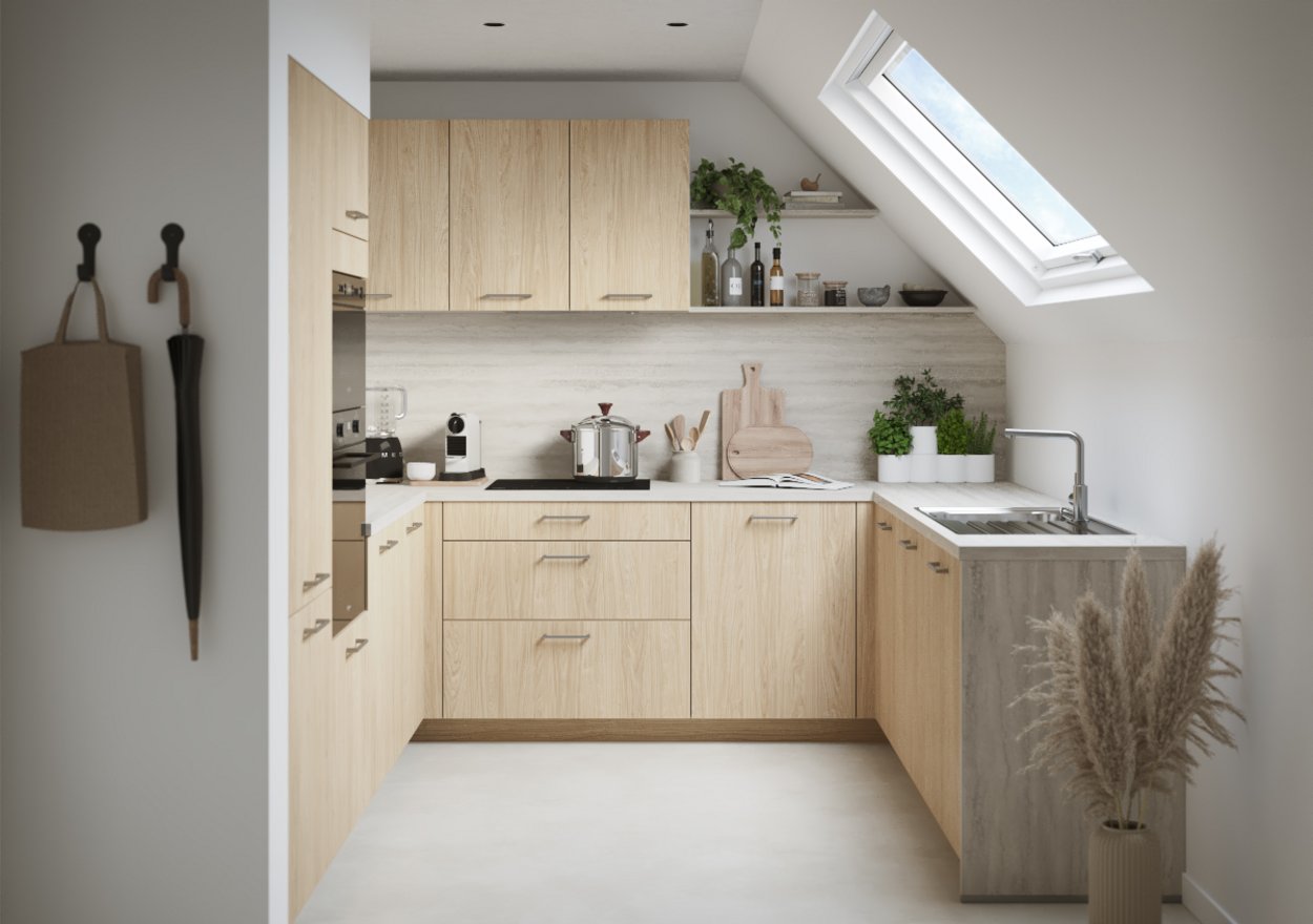 Diseñada en roble, revela la calidez de la madera natural, realzada por la ligereza de las fachadas blancas en los muebles altos. Sus laterales cuidadosamente trabajados y sus tiradores característicos del estilo Japandi le aportan un carácter a la vez auténtico y atemporal.
