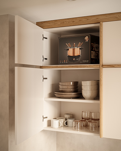 ¡Se acabaron las frutas dando vueltas por la encimera! Discreta y perfectamente integrada, la Pantry-box, de diseño depurado, acoge tus frutas y verduras de uso diario, prolongando su frescura y su vida útil.