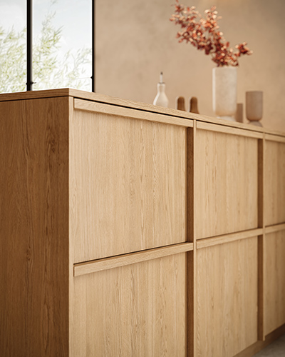 Los laterales finamente trabajados prolongan la pureza de las líneas, mientras que los tiradores, de formas sobrias y naturales, evocan la artesanía japonesa. Un equilibrio sutil entre presencia y discreción.