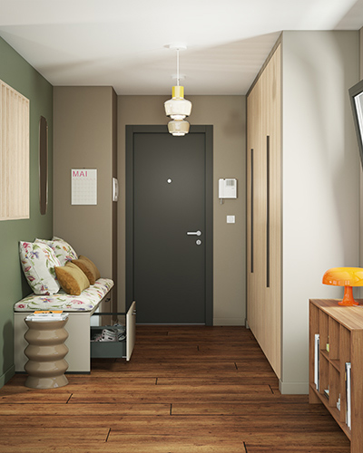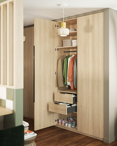 Cada espacio de almacenamiento encuentra su lugar en este vestidor inteligente, situado en la entrada. Cajones, estantes, armario colgador: todo está diseñado para optimizar el espacio con elegancia.