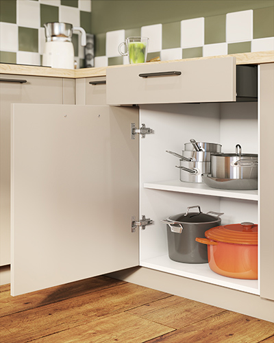 Con su cajón, este mueble bajo acoge fácilmente ollas, utensilios e imprescindibles del día a día. Para una cocina a la vez bonita y práctica.