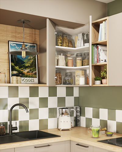 El mueble alto de esquina aprovecha cada centímetro disponible. Ingenioso y práctico, ofrece un volumen de almacenamiento generoso, de fácil acceso en el día a día.
