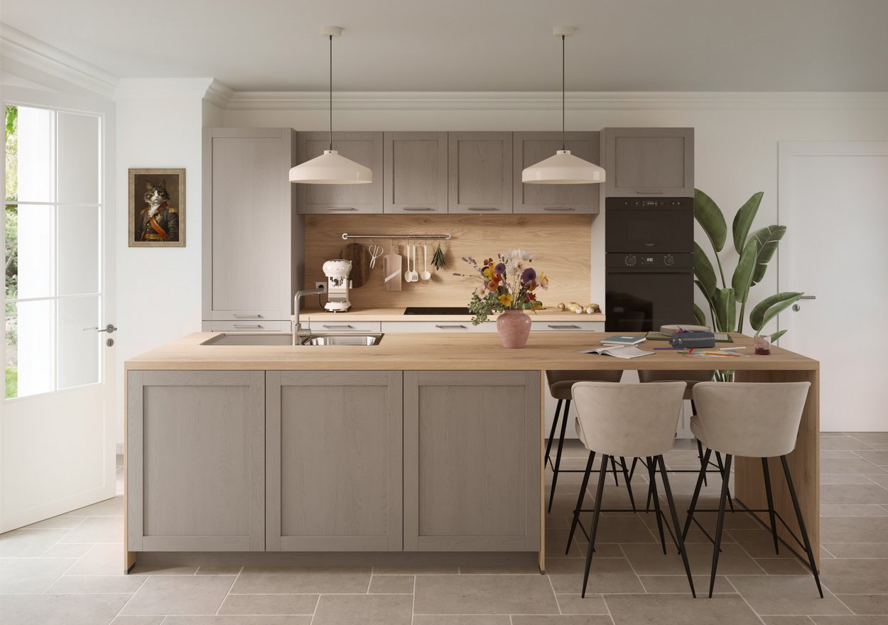 Solea Cottage encarna el equilibrio perfecto entre autenticidad y refinamiento. Sus fachadas con marco evocan el espíritu de las casas de campo, mientras que sus líneas sobrias y acabados delicados le confieren un aire atemporal. La combinación de la madera de la encimera con las fachadas “macchiato” sutilmente texturizadas crea una atmósfera cálida y luminosa, propicia para compartir y disfrutar en compañía. Los juegos de luz y los contrastes delicados resaltan la belleza natural del conjunto.