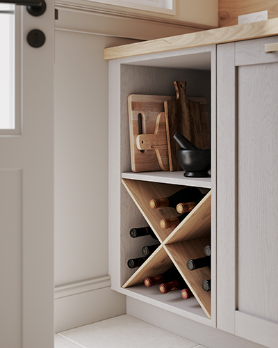 Este accesorio portabotellas en cruz es perfecto para mantener tus vinos favoritos al alcance de la mano. Justo encima, un nicho abierto acoge tablas o objetos decorativos, aportando un toque personal y auténtico a tu cocina.
