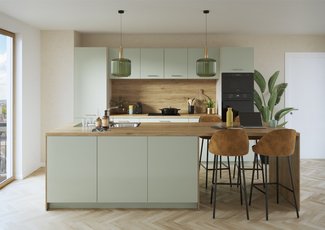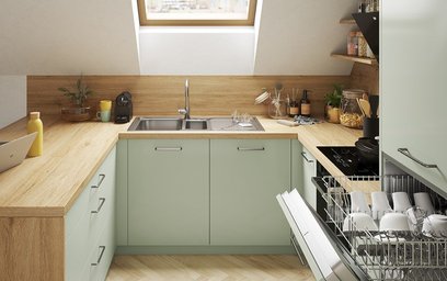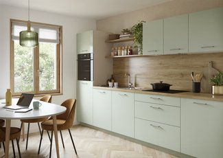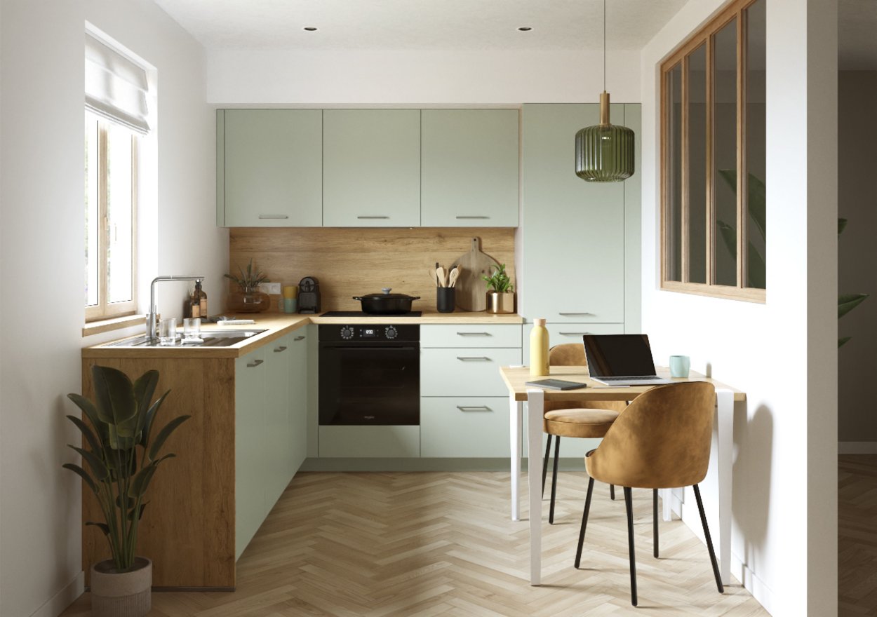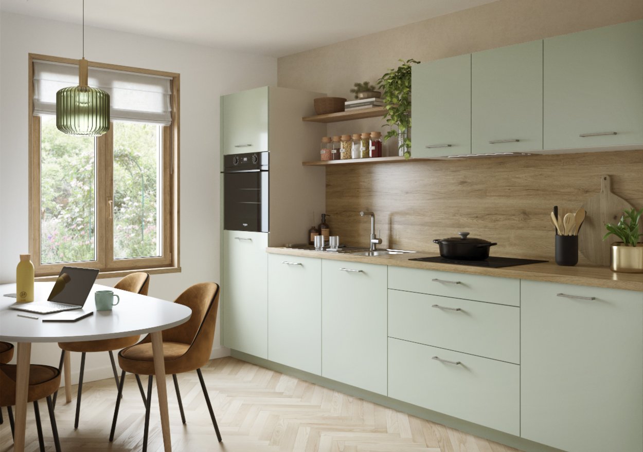 Pequeña, sí, pero sobre todo práctica y acogedora. Con sus tonos verde jade, esta cocina te aportará tranquilidad y suavidad. Su configuración permite delimitar los espacios de manera inteligente. Y si lo deseas, puedes extender este bonito verde a tus muebles de salón, para un efecto zen asegurado.
