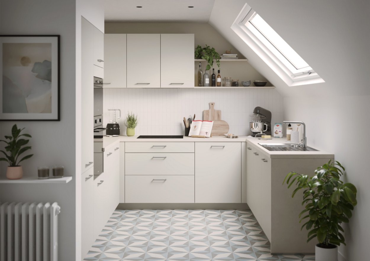 ¡Respira! Con frentes y encimera de color arena fina y madera de haya Yukon, esta cocina Moda se caracteriza por un ambiente fresco y luminoso, que imprime tranquilidad y autenticidad. Un entorno muy limpio y sencillo que esconde tesoros muy práctico