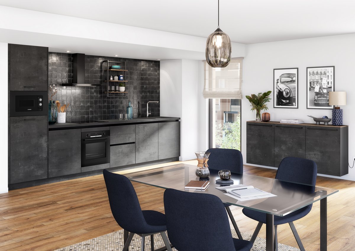 ¿Tiene carácter? Esta cocina también. Es tan funcional como bonita, con un efecto de hormigón que realza su estilo industrial. Su pequeño extra: un aparador a juego, personalizado a tu elección entre una amplia gama de combinaciones, ¡y realzado por una encimera decorada en madera!