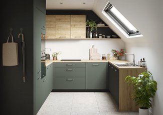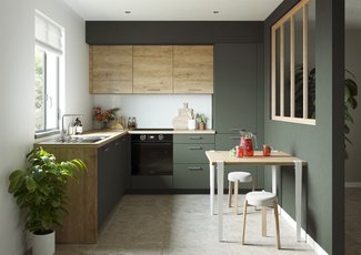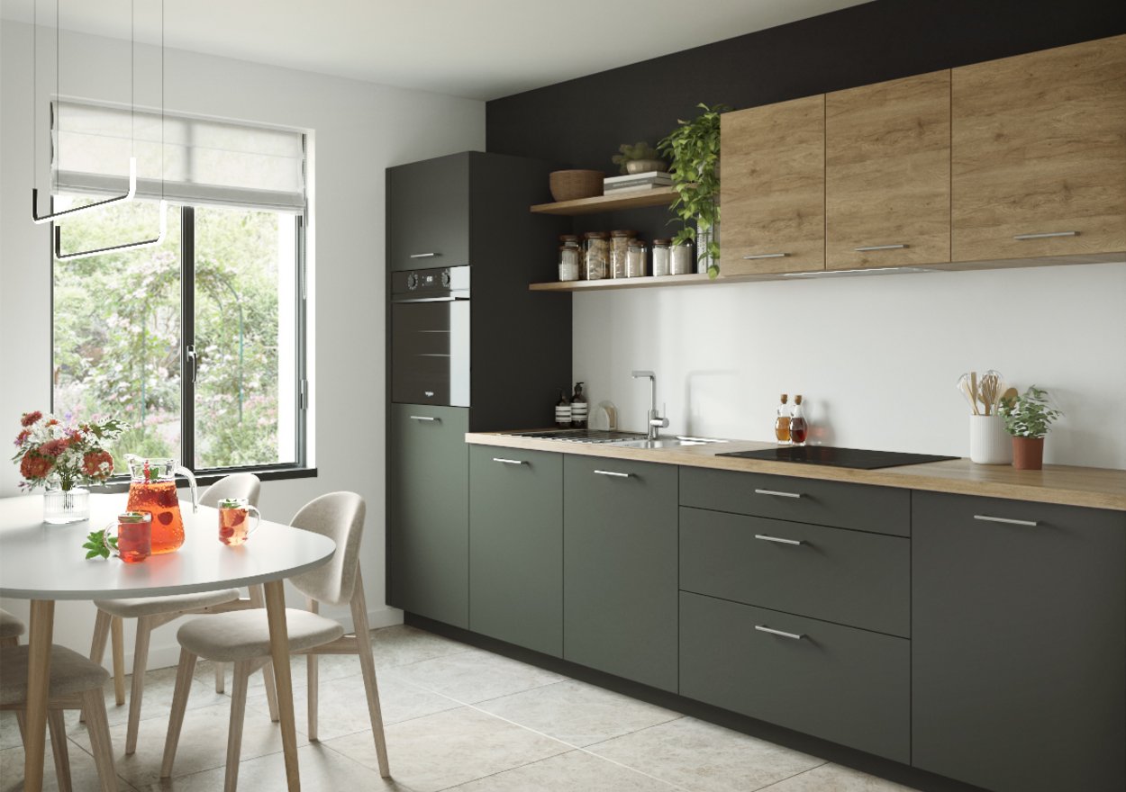 La cocina Velvet nos seduce con sus contrastes entre la luminosidad de la encimera, de madera de haya Sierra y la profundidad de los frentes en verde mineral. Una inspiración muy «natural» auténtica y, a la vez, contemporánea.